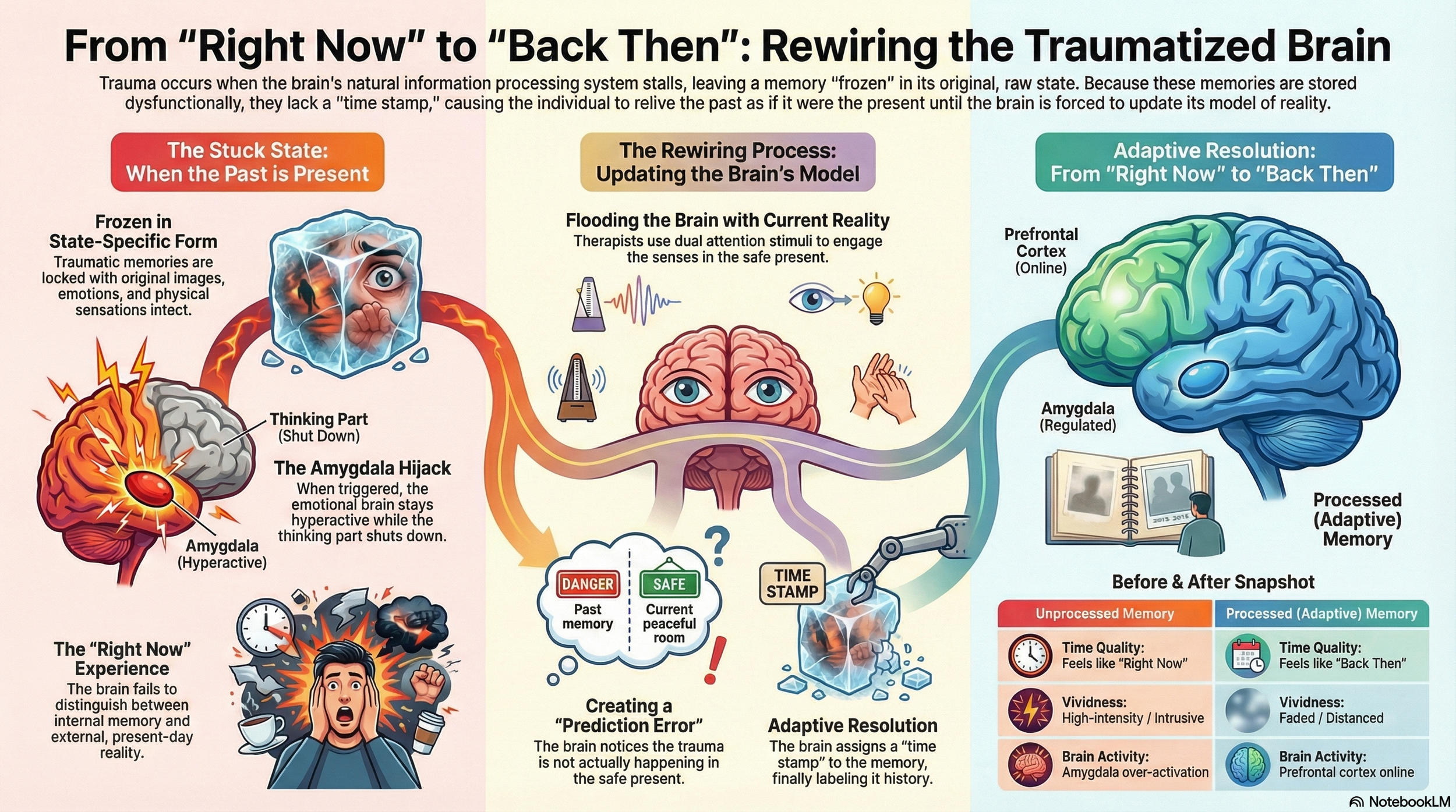 When we experience overwhelming or traumatic events, the brain may not fully process the experience at the time. As a result, memories can remain “stuck,” continuing to trigger strong emotional or physical reactions in the present. It is similar to a physical wound that hasn't healed because there is debris inside; the memory is festering because it hasn't been fully digested by your brain.